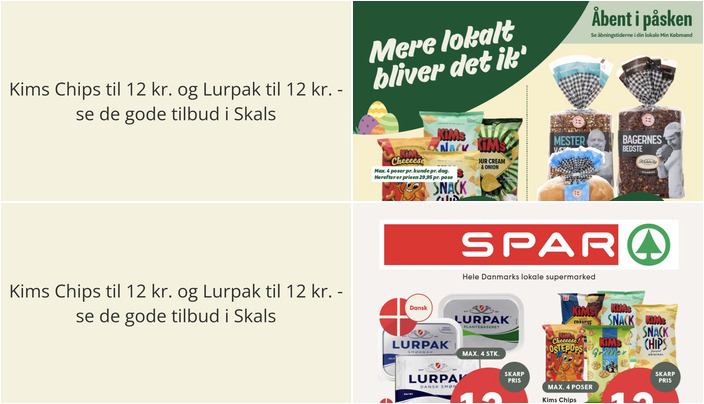 Spar har et godt tilbud på Kims Chips eller Snacks, hvor du kan få flere varianter (95-170 g) til kun 12 kr. pr. pose. Tilbuddet gælder fra fredag den 27. marts til og med lørdag den 4. april 2026.